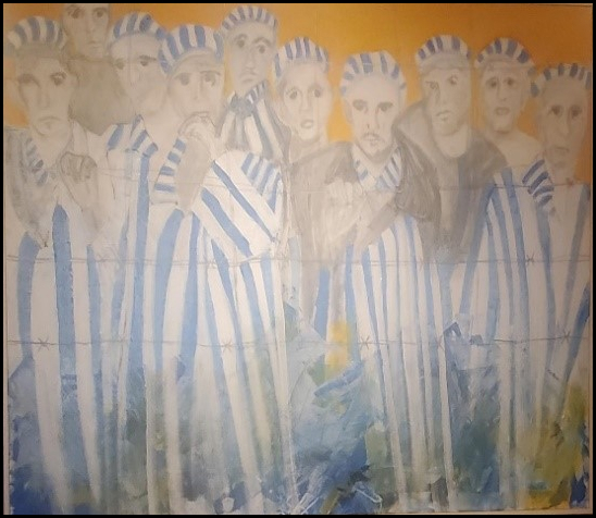 I could recognize the striped uniform that the characters in the painting wore, after all I have seen it hundreds of times before, in pictures and movies and history books but I something was missing something that I could not place yet. Rimmel explained that instead of using the yellow star of David- a symbol that was forced upon the Jews to wear in that period, he felt it would be more fitting to use the colours in the background and not enforce it on them in his paintings. and indeed, his choice of not showing the start of David, to me symbolizes his empathy with those victims, and they have the right to be treated as human and to be celebrated and immortalized.