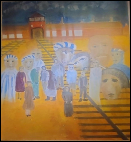 One painting in particular, of a mother carrying a child on her back in shades of red and yellow blending them with their background, brings to life similar images that we've seen many times in the news off refugees fleeing were sticking areas and genocide around the world. it stands as a reminder that history can repeat itself, it reminds us of the horrors that can happen despite the fact that the Nazis were abolished evil still roams the earth and we cannot afford to turn the other cheek on it.